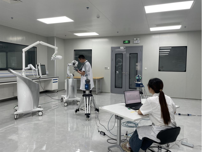 广东省医械所技术人员在对智能穿刺机器人进行检测。