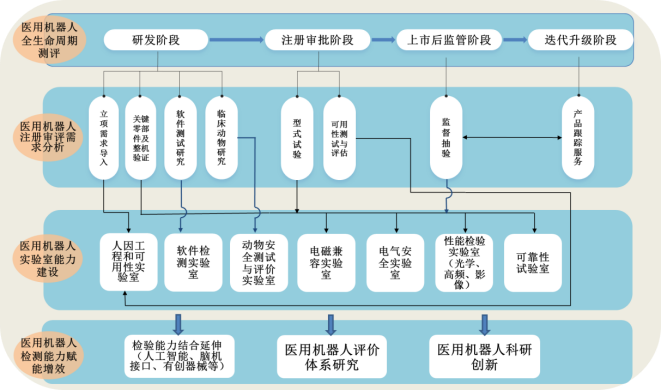 构建创新医疗器械检测技术及标准研究实验室,研究、解读和宣贯最新的国际标准,应用于自主医用机器人一体化测试与评价平台,提升平台的检测技术水平,更好帮助企业在设计阶段识别和规避潜在风险,为医用机器人设计、测试和认证提供更有效、更准确的方法,提高医用机器人安全性和有效性。