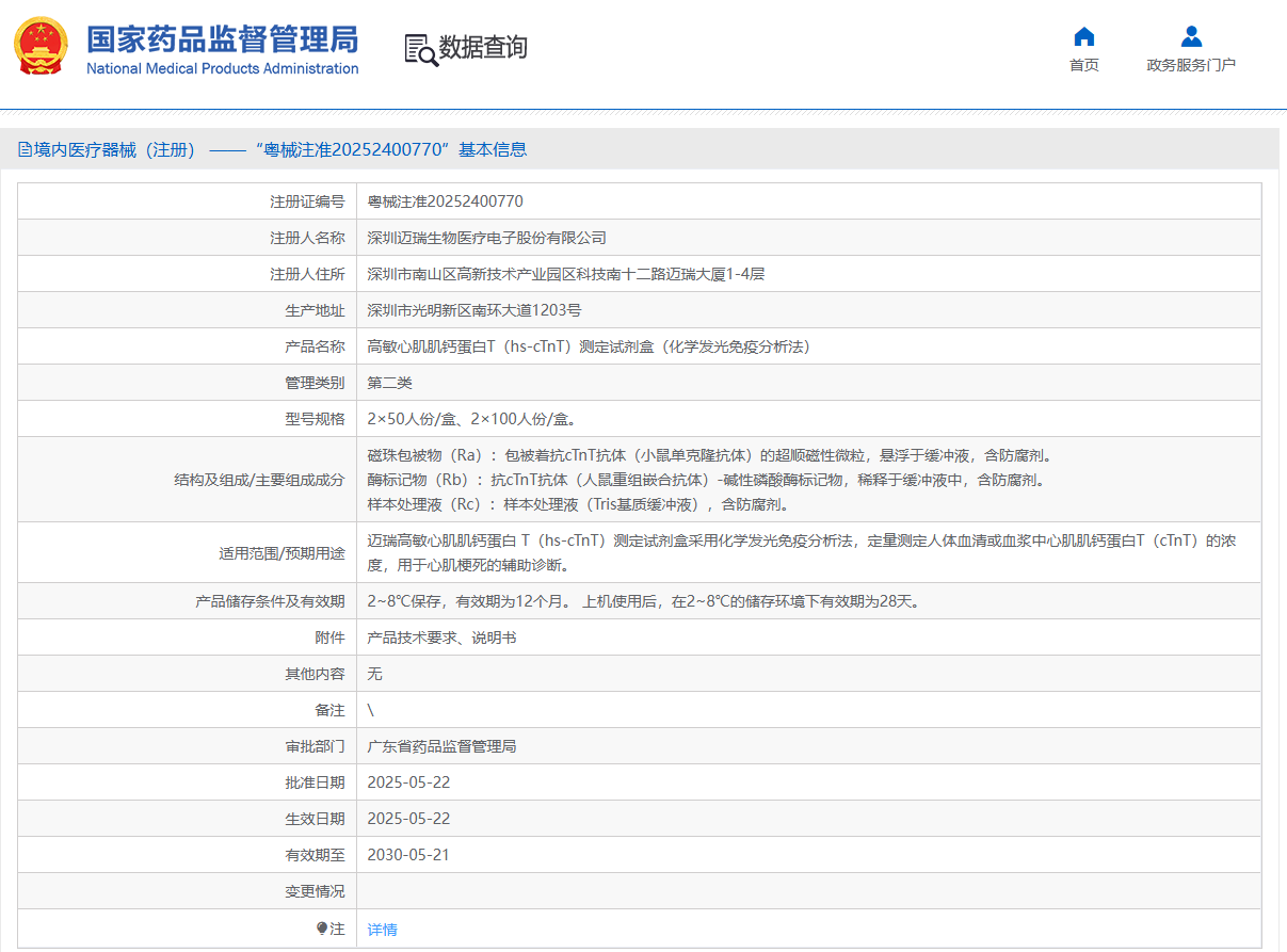 “高敏心肌肌钙蛋白T(hs-cTnT)测定试剂盒(化学发光免疫分析法)”由深圳迈瑞生物医疗电子股份有限公司自主研发,通过定量测定人体血清或血浆中心肌肌钙蛋白T(cTnT)的浓度,用于心肌梗死的辅助诊断。