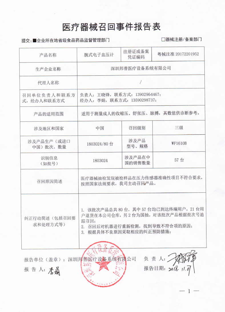 深圳邦普医疗设备系统有限公司报告,该公司生产的腕式电子血压计经检验,不符合标准规定。深圳邦普医疗设备系统有限公司主动召回有关产品,召回级别为三级。涉及产品的型号、规格及批次等详细信息见《医疗器械召回事件报告表》。