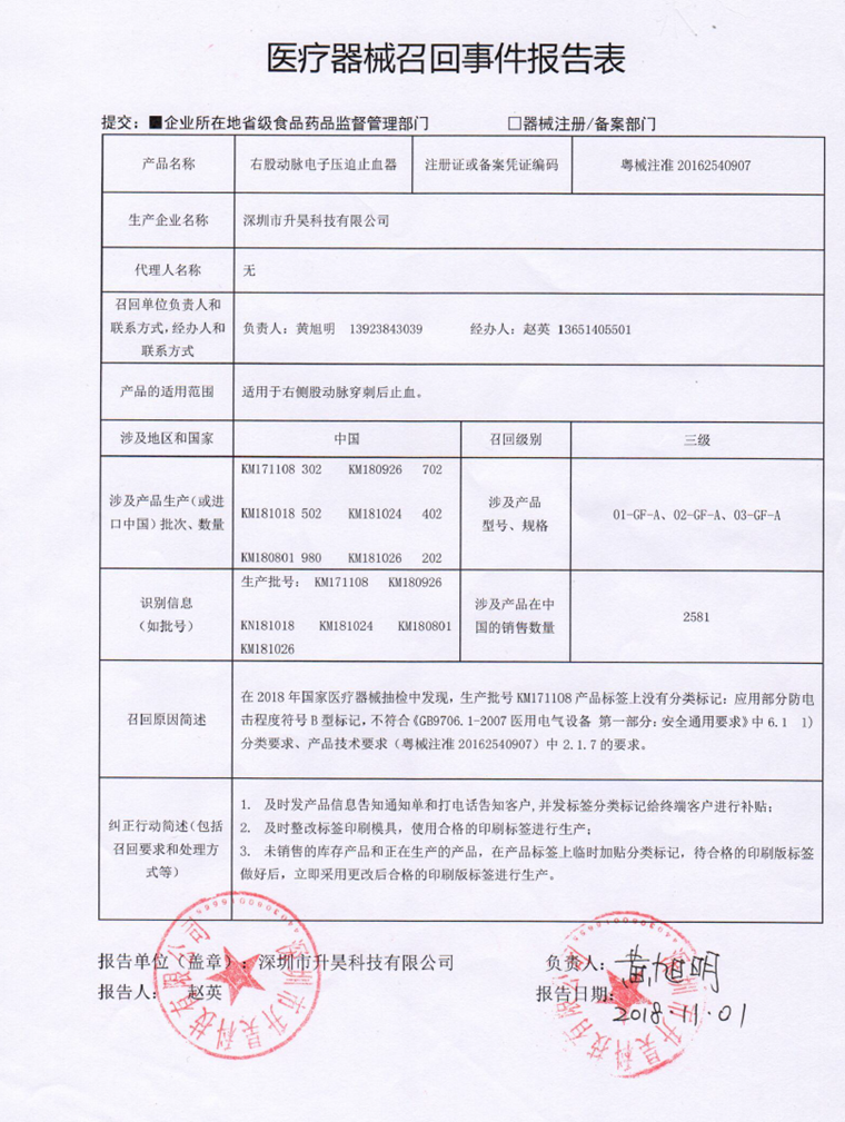 深圳市升昊科技有限公司报告,该公司生产的右股动脉电子压迫止血器经检验,不符合标准规定。深圳市升昊科技有限公司主动召回有关产品,召回级别为三级。涉及产品的型号、规格及批次等详细信息见《医疗器械召回事件报告表》。