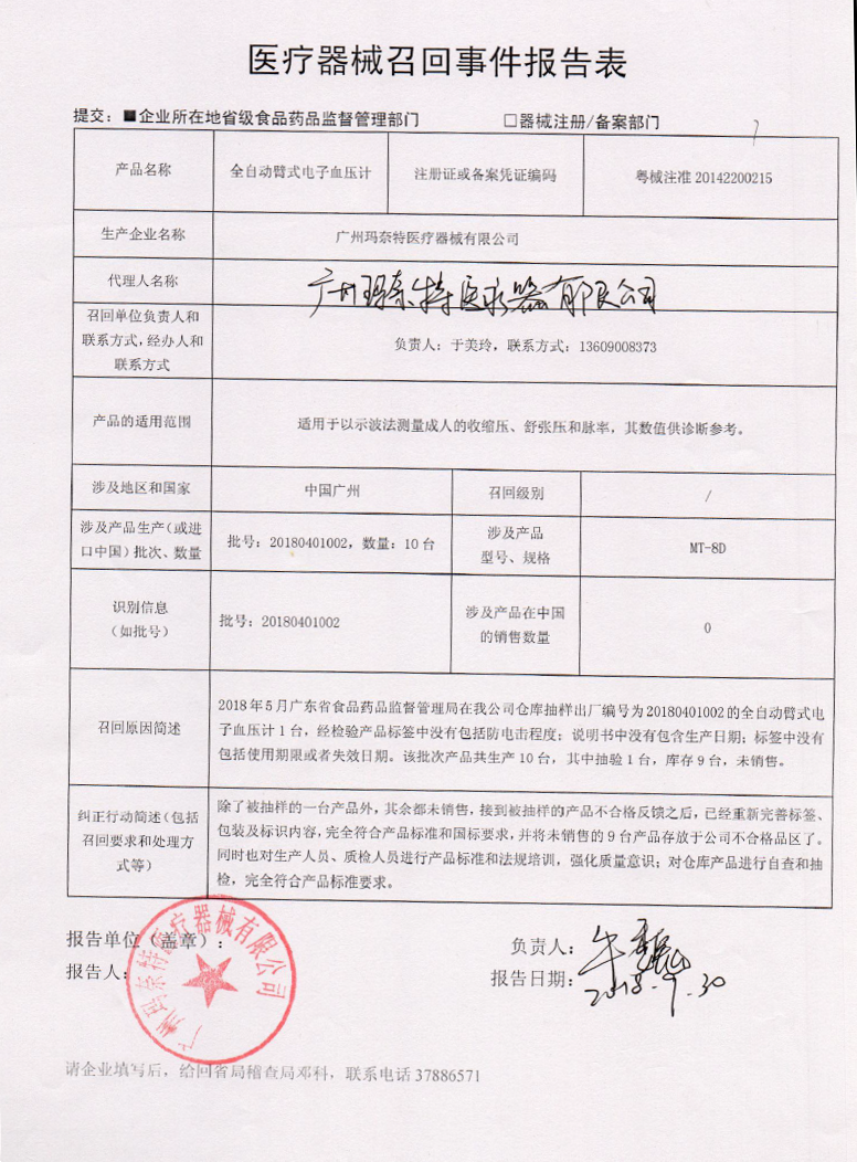 广州玛奈特医疗器械有限公司报告,该公司生产的全自动臂式电子血压计经检验,不符合标准规定。广州玛奈特医疗器械有限公司主动召回有关产品。涉及产品的型号、规格及批次等详细信息见《医疗器械召回事件报告表》。