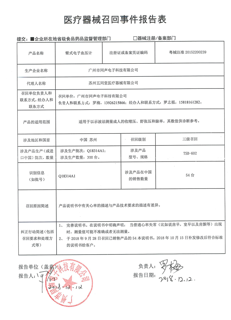 广州市同声电子科技有限公司对臂式电子血压计主动召回